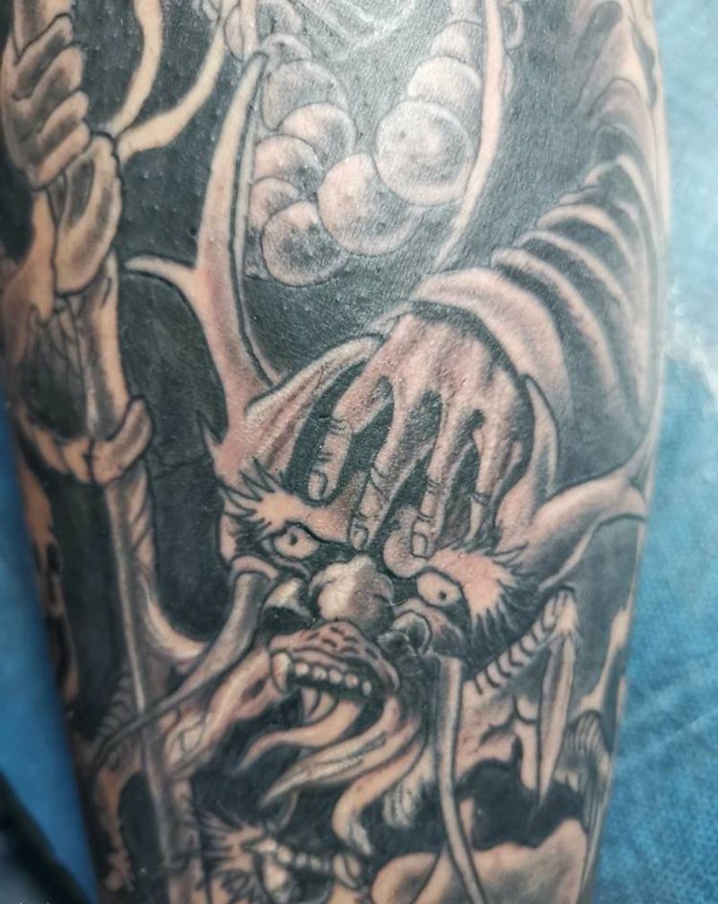 • T网红王老大花腿龙纹身图片_腿部新传统纹身图案