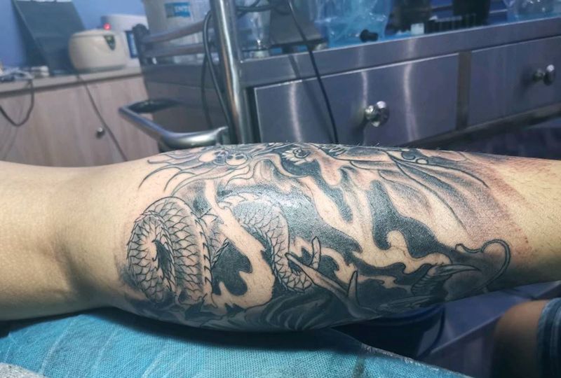 • T网红王老大花腿龙纹身图片_腿部新传统纹身图案