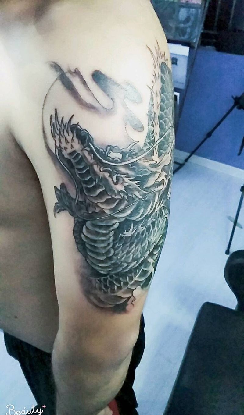 • T网红王老大花腿龙纹身图片_腿部新传统纹身图案