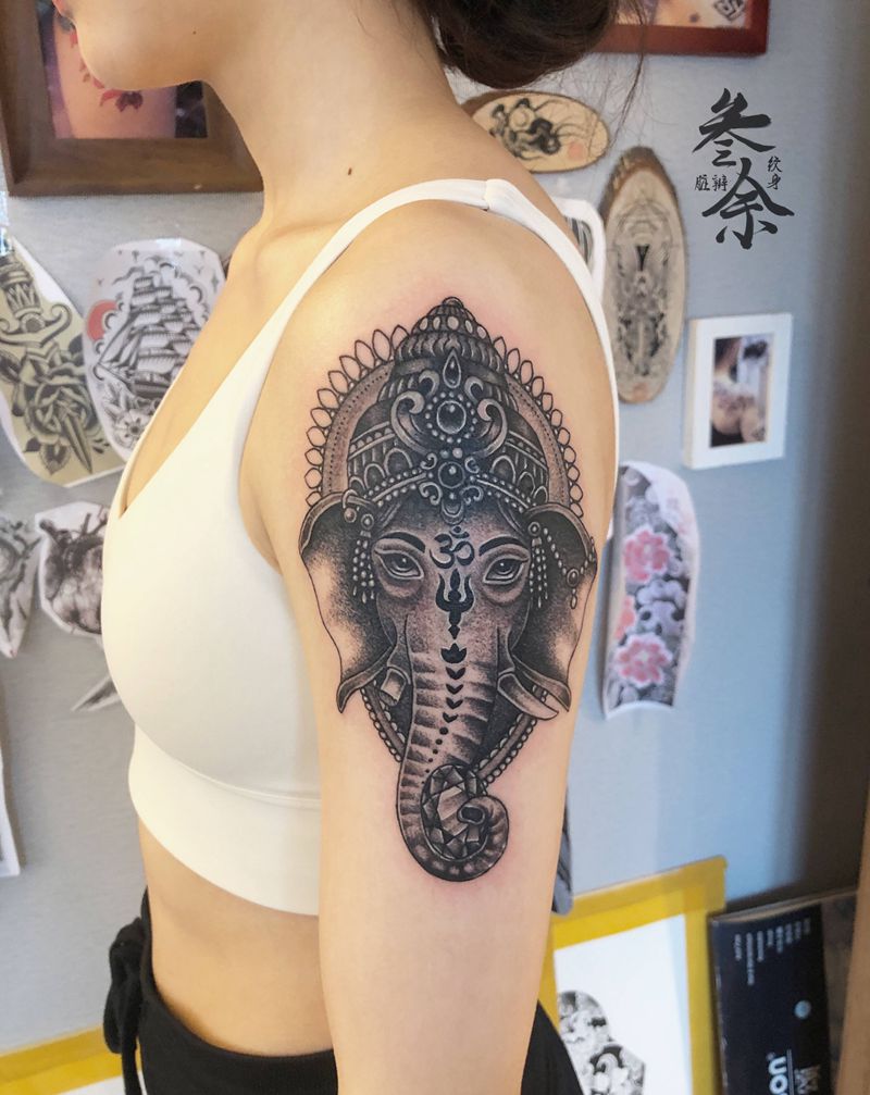 当前位置: 首页 >浙江省杭州市纹身店-杭州三鱼纹身工作室纹身图案>象神遮盖纹身图片_手臂点刺纹身图案