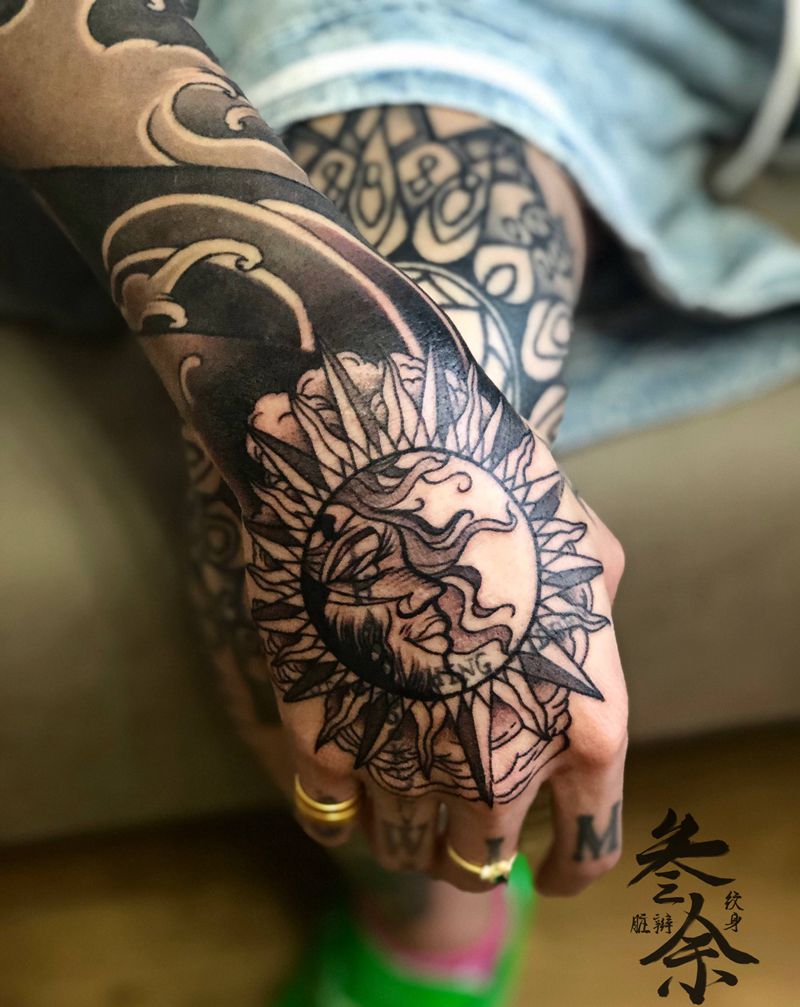 水浪云纹太阳月亮纹身纹身图片_手部手臂老传统纹身图案
