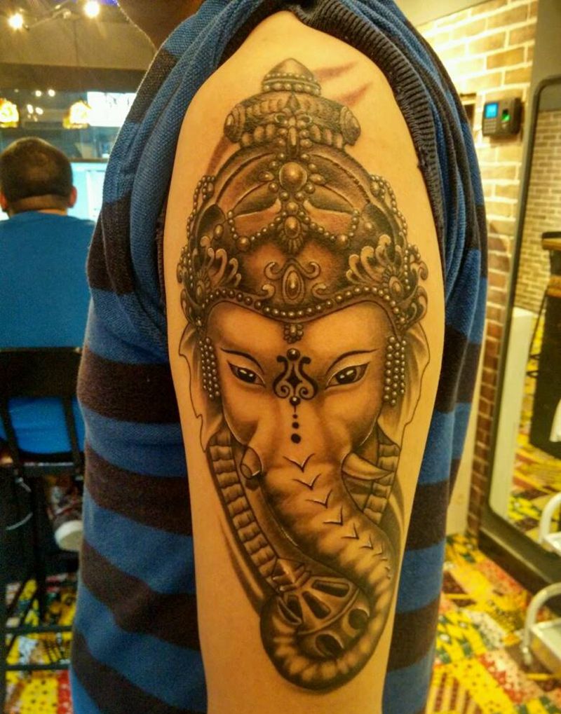 当前位置: 首页 >浙江省杭州市纹身店-杭州三鱼纹身工作室纹身图案>象神纹身图片_手臂传统宗教纹身图案