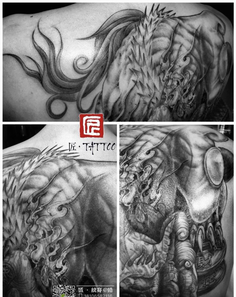 遮盖满背貔貅,进度60%纹身图片_背部传统写实习俗动物静物鬼神宗教纹身图案