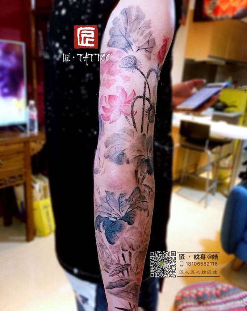 原创水墨花臂完工纹身图片_成品手臂国画静物植物原创纹身图案