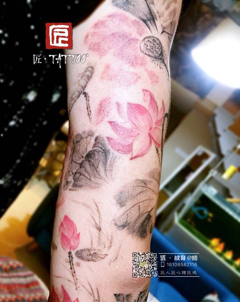 原创水墨花臂完工纹身图片_成品手臂国画静物植物原创纹身图案