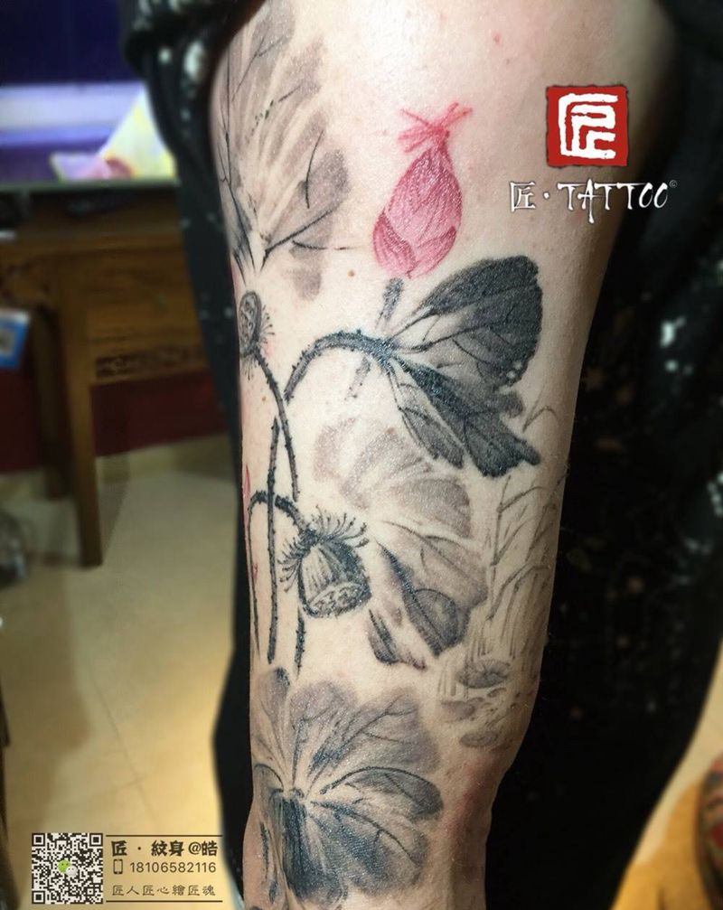 原创水墨花臂完工纹身图片_成品手臂国画静物植物原创纹身图案