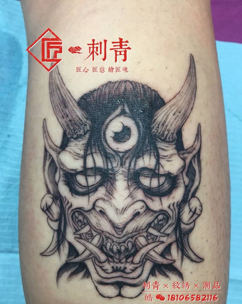 当前位置: 首页 >浙江省杭州市纹身店-久灵纹艺纹身图案>天眼般若纹身图片_成品鬼神写实腿部纹身图案