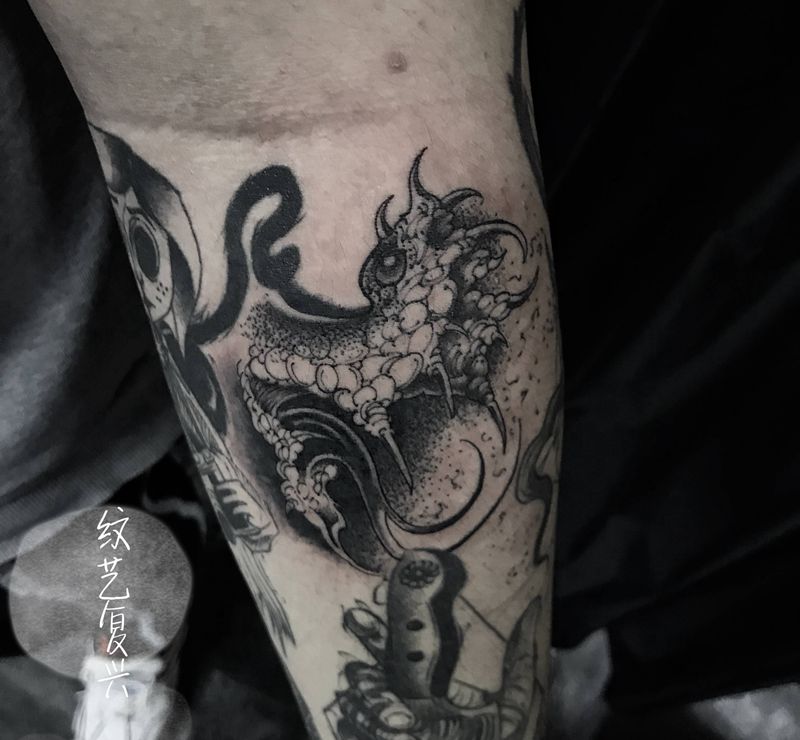• T网红王老大花腿龙纹身图片_腿部新传统纹身图案