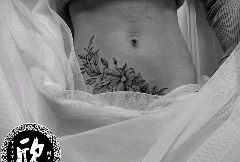 素花(遮盖刨腹产)纹身图片_腹部纹身图案