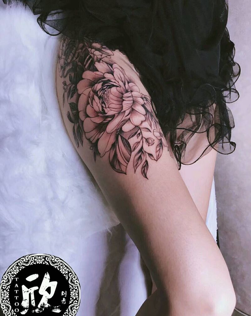 素花纹身图片_腿部纹身图案