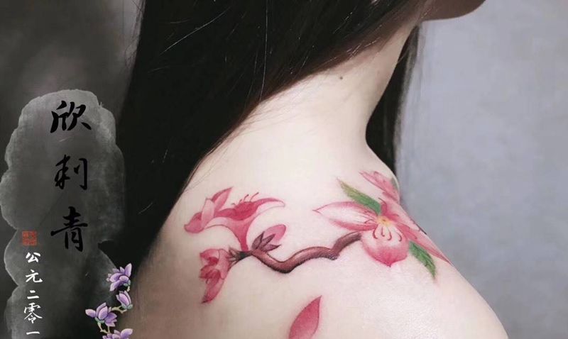 樱花纹身图片_肩部水彩纹身图案