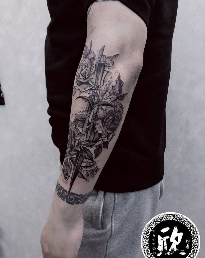 当前位置: 首页 >浙江省杭州市纹身店-纹艺复兴纹身图案>线条匕首玫瑰纹身图片_手臂纹身图案