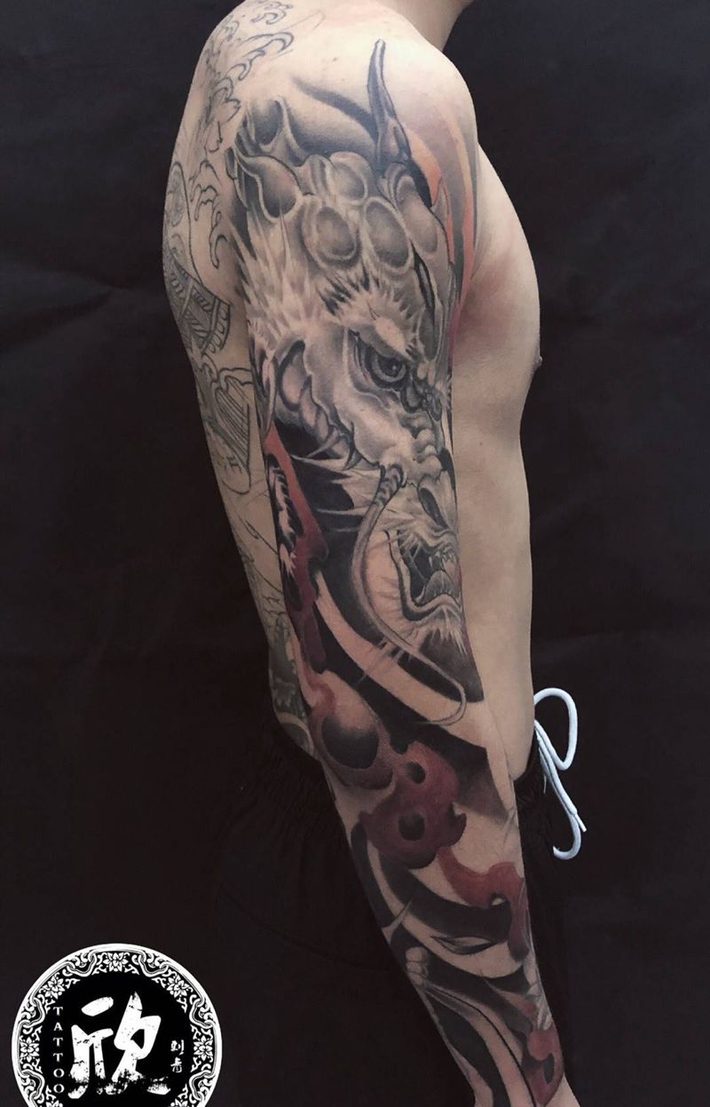 当前位置: 首页 >浙江省杭州市纹身店-纹艺复兴纹身图案>花臂龙纹身图片_手臂新传统纹身图案