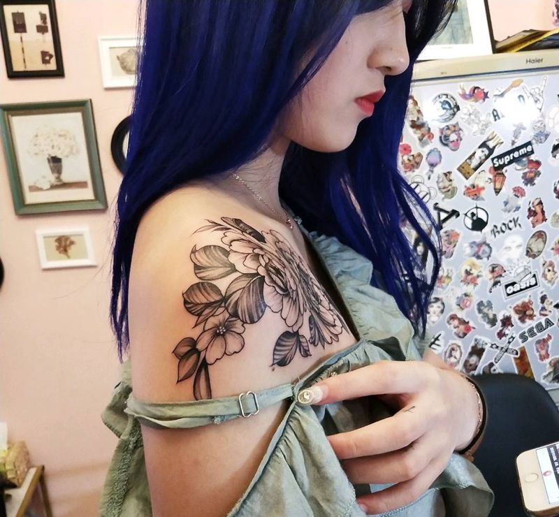 当前位置: 首页 >浙江省杭州市纹身店-非·刺青工作室纹身图案>素花纹身图片_肩部点刺素花纹身图案