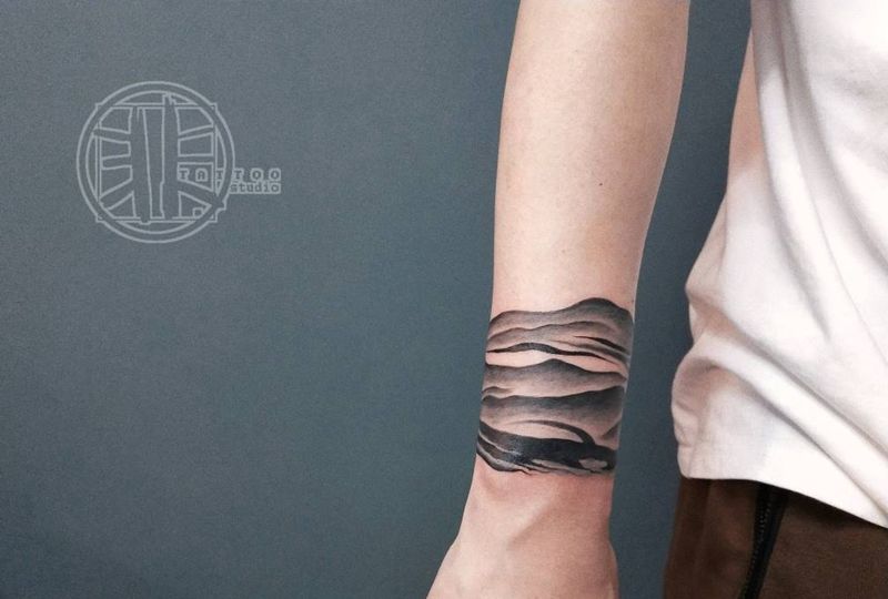 山-云海纹身图片_手臂新传统水墨手环纹身图案