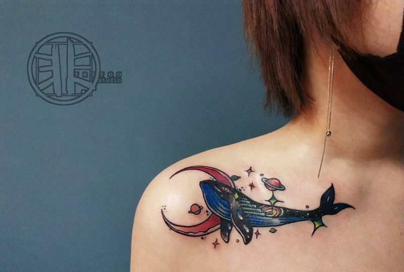 当前位置: 首页 >浙江省杭州市纹身店-非·刺青工作室纹身图案>鲸鱼纹身图片_肩部New SchoolOld School鲸鱼遮盖旧纹身图案