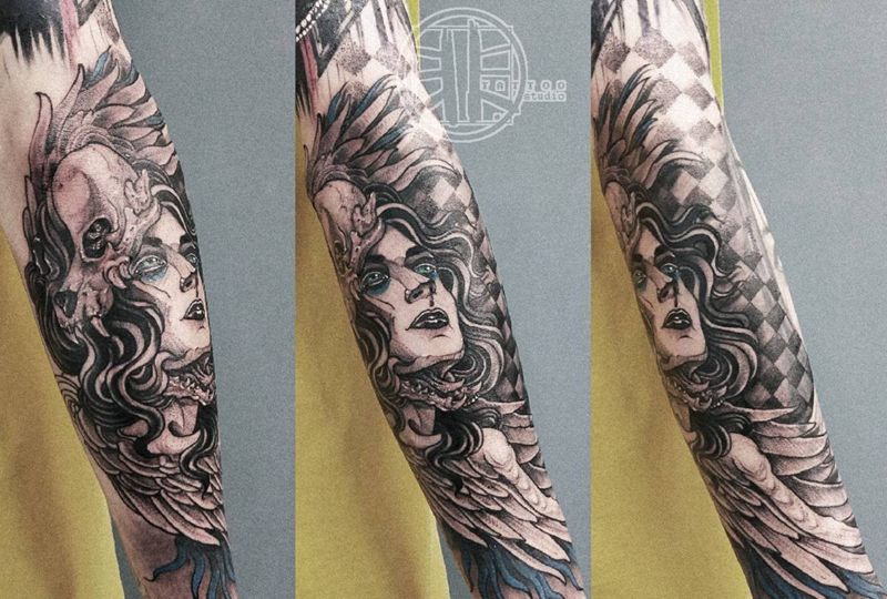当前位置: 首页 >浙江省杭州市纹身店-非·刺青工作室纹身图案>花臂拼接 遮盖纹身图片_手臂欧美写实点刺遮盖旧纹身图案