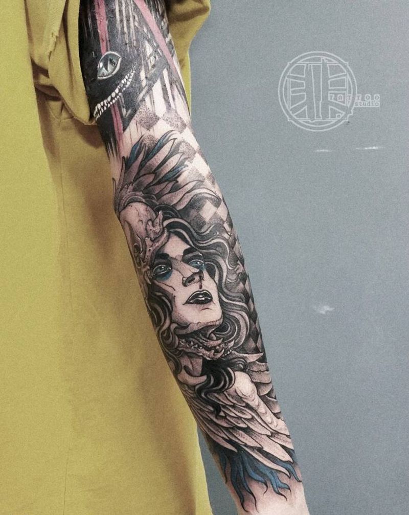 当前位置: 首页 >浙江省杭州市纹身店-非·刺青工作室纹身图案>花臂拼接 遮盖纹身图片_手臂欧美写实点刺遮盖旧纹身图案