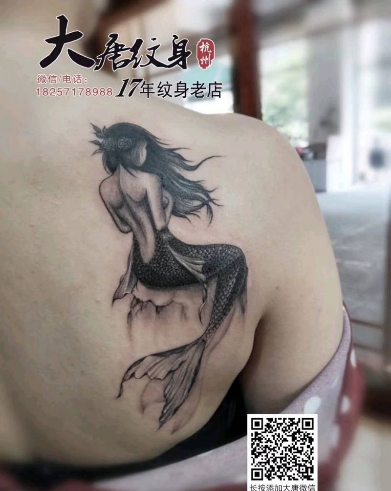 美人鱼作品纹身图片_背部黑灰纹身图案