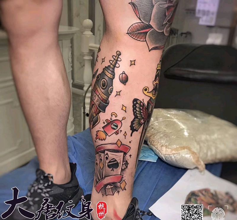 当前位置: 首页 >浙江省杭州市纹身店-大唐纹身纹身图案>old school纹身图片_腿部Old School水彩纹身图案