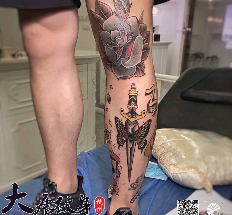 当前位置: 首页 >浙江省杭州市纹身店-大唐纹身纹身图案>old school纹身图片_腿部Old School水彩纹身图案