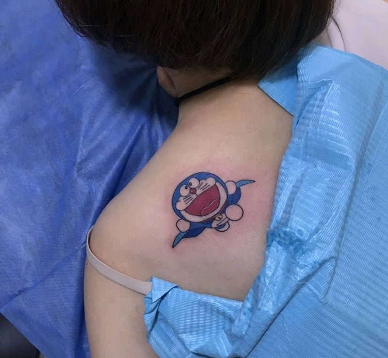 叮当猫纹身图片_背部水彩小清新纹身图案
