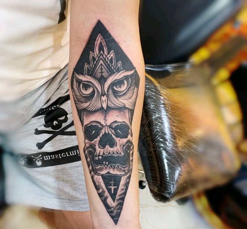 猫头鹰+骷髅纹身图片_手部点刺黑灰纹身图案