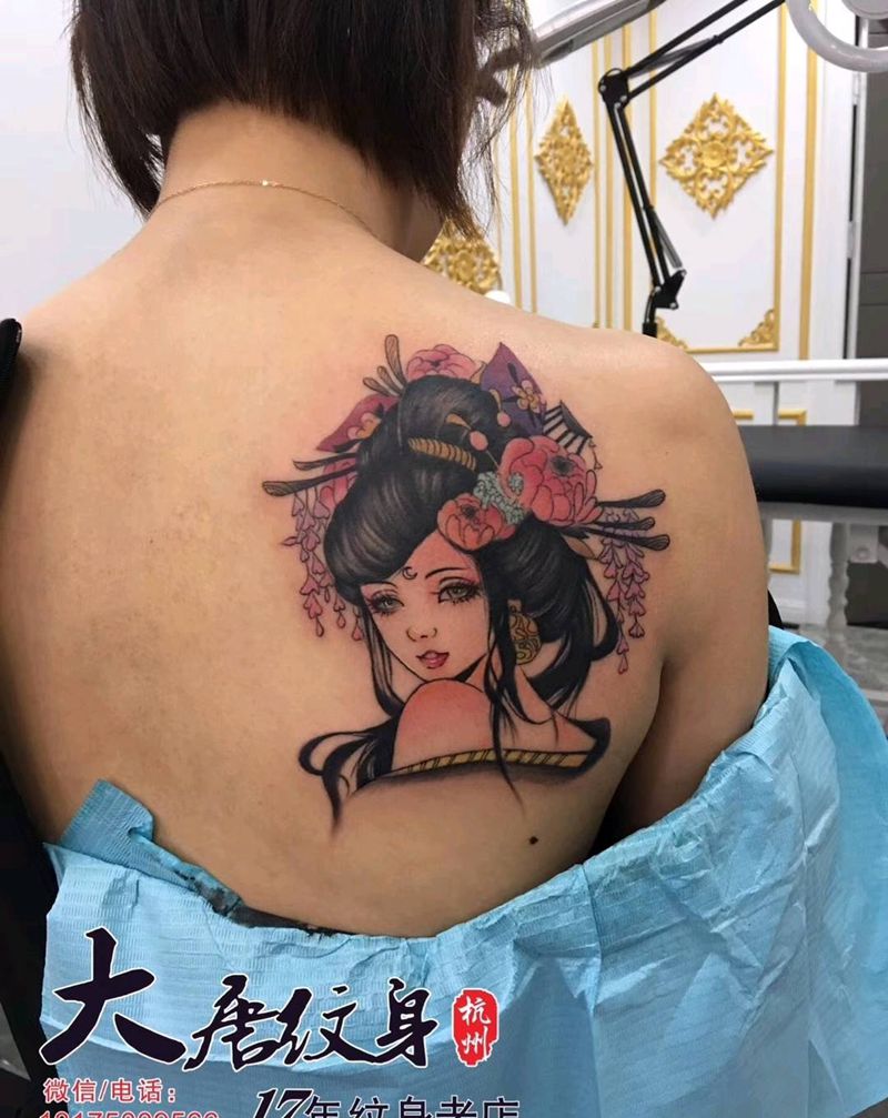 当前位置: 首页 >浙江省杭州市纹身店-大唐纹身纹身图案>艺妓纹身图片_背部新传统水彩纹身图案