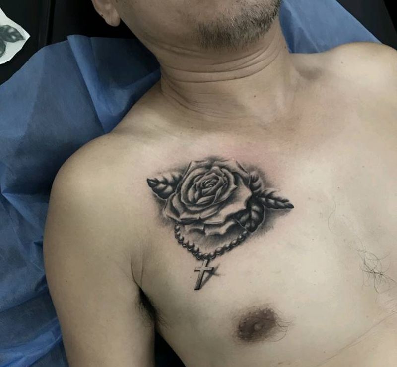 玫瑰纹身图片_胸部欧美写实纹身图案