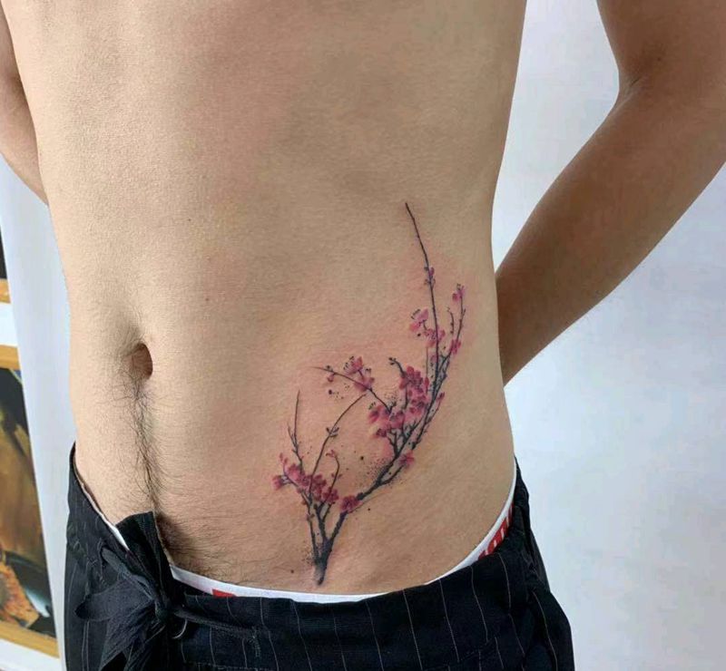 梅花纹身图片_腰部水墨水彩纹身图案