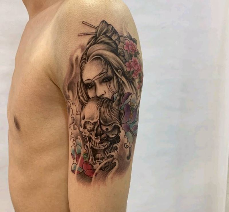 艺妓般若纹身图片_手臂新传统水彩纹身图案