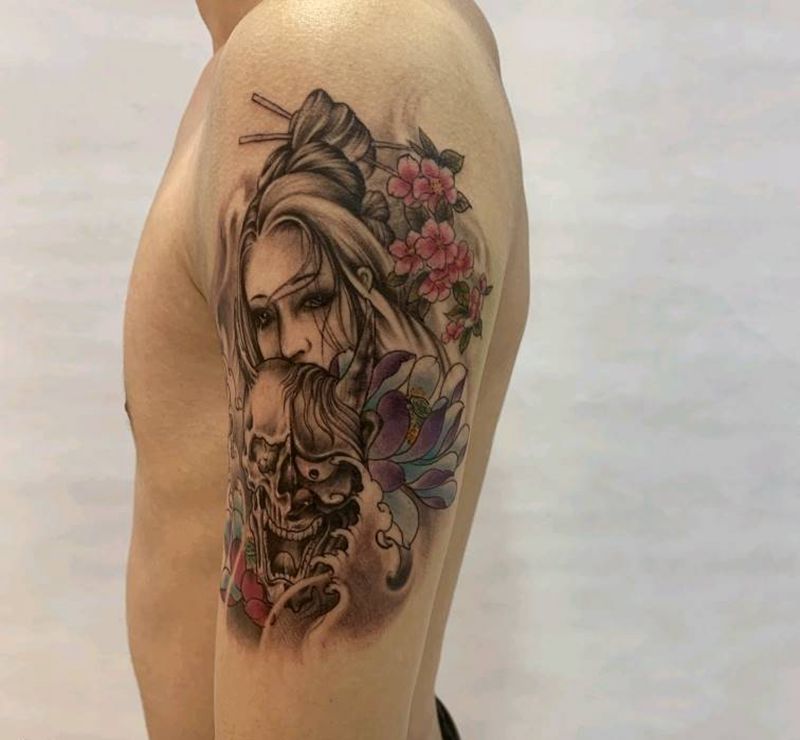 艺妓般若纹身图片_手臂新传统水彩纹身图案