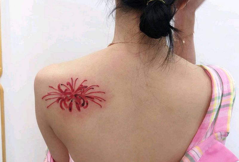 彼岸花纹身图片_肩部水彩小清新纹身图案