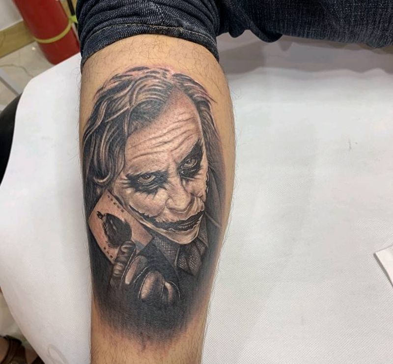 当前位置: 首页 >浙江省杭州市纹身店-大唐纹身纹身图案>小丑希斯莱杰纹身图片_腿部欧美写实纹身图案
