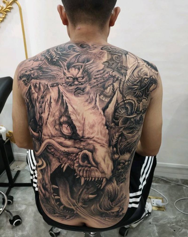 九龙拉官纹身图片_背部新传统纹身图案