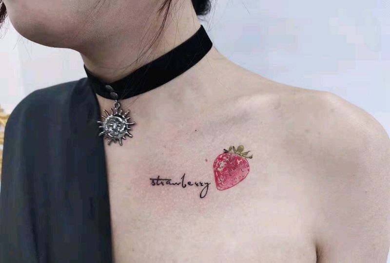 一颗草莓纹身图片_胸部欧美写实水彩纹身图案