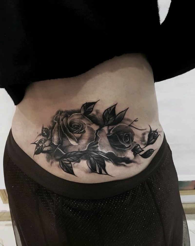 黑灰玫瑰纹身图片_腰部水墨黑灰纹身图案