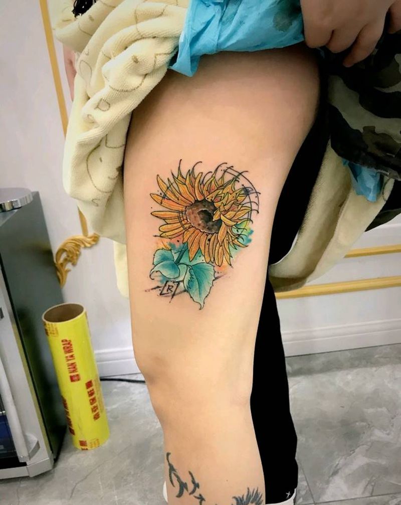 当前位置: 首页 >浙江省杭州市纹身店-大唐纹身纹身图案>向日葵纹身图片_腿部水彩纹身图案