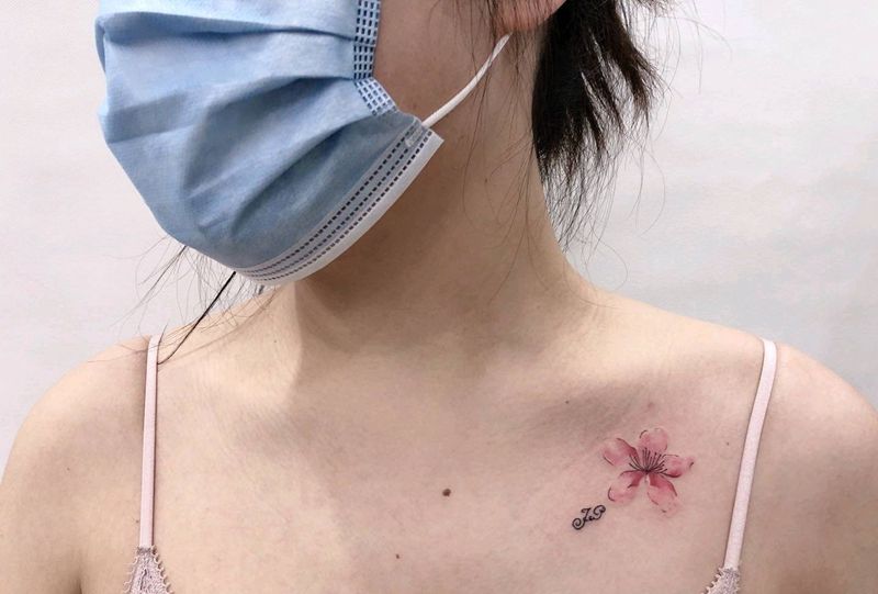 一朵小花纹身图片_肩部彩色小清新纹身图案