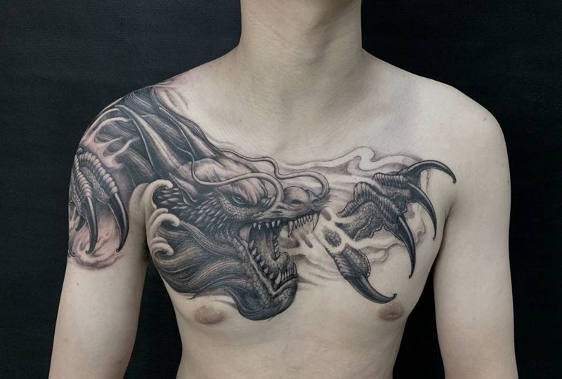 过肩龙纹身图片_背部胸部新传统纹身图案
