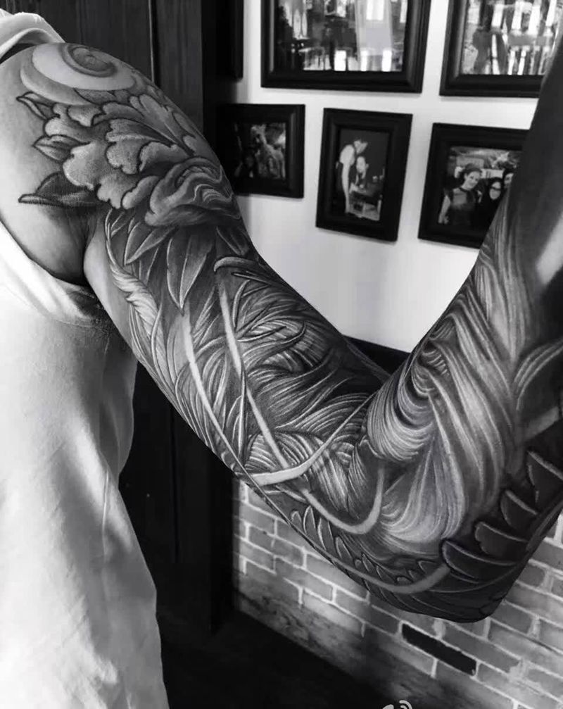 凤凰牡丹传统花臂纹身图片_成品手臂传统动物肩部原创纹身图案