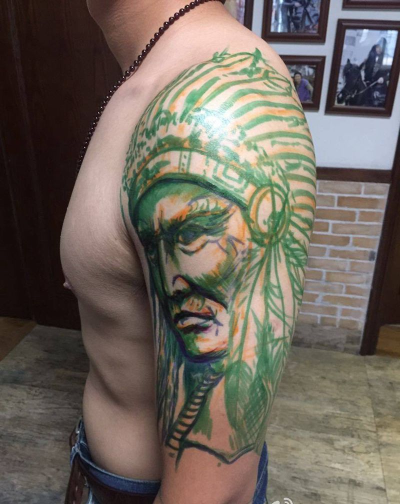 当前位置: 首页 >浙江省杭州市纹身店-异绣堂纹身工作室纹身图案>印第安人纹身图片_成品原创人物手臂肖像纹身图案
