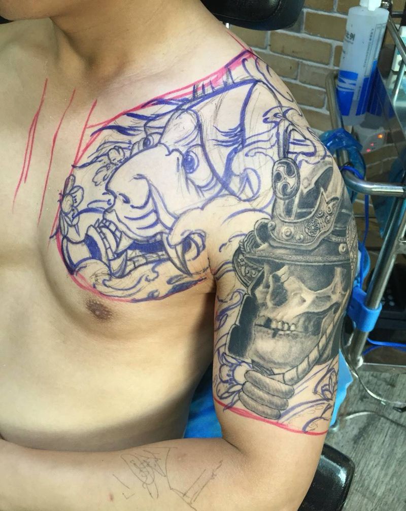 当前位置: 首页 >浙江省杭州市纹身店-异绣堂纹身工作室纹身图案>半甲纹身图片_成品肩部胸部手臂传统鬼神原创纹身图案