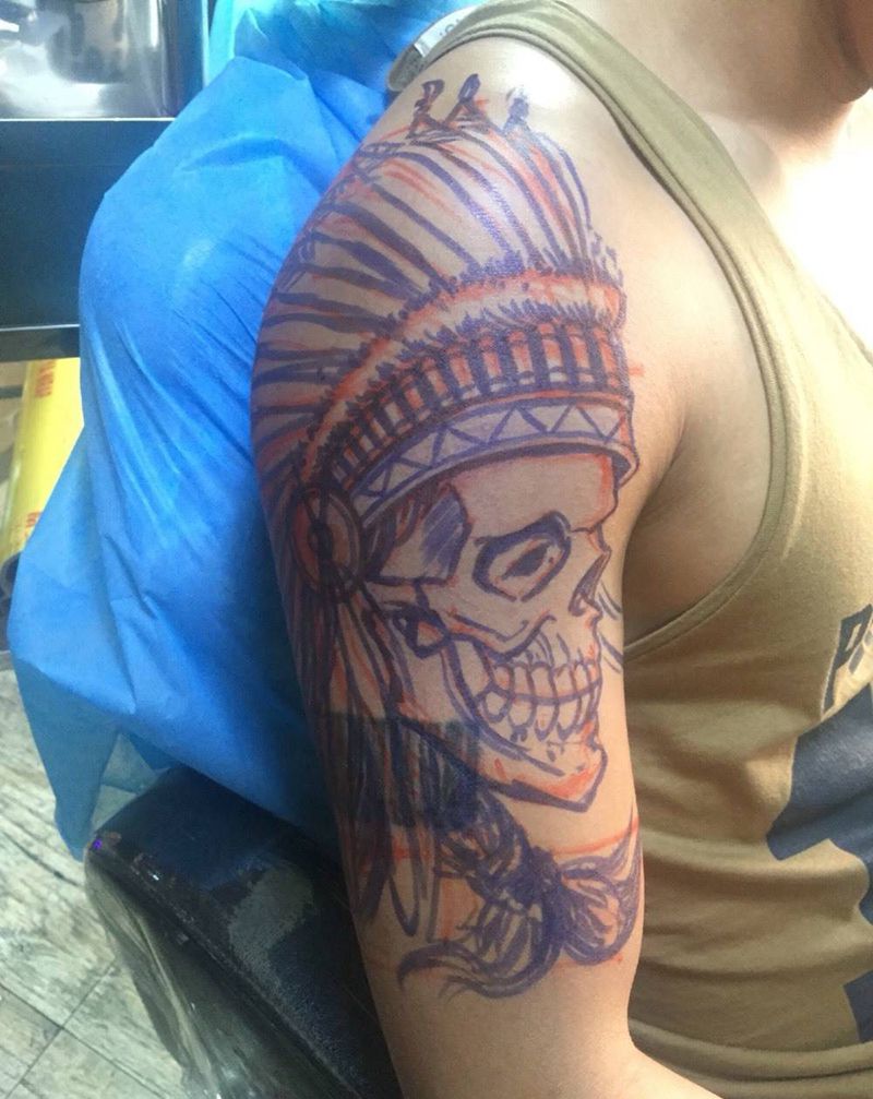 当前位置: 首页 >浙江省杭州市纹身店-异绣堂纹身工作室纹身图案>印第安人骷髅纹身图片_手臂欧美人物原创纹身图案