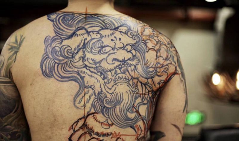 当前位置: 首页 >浙江省杭州市纹身店-异绣堂纹身工作室纹身图案>唐狮半成品纹身图片_人物成品手稿宗教原创鬼神国画字符写实背部纹身图案