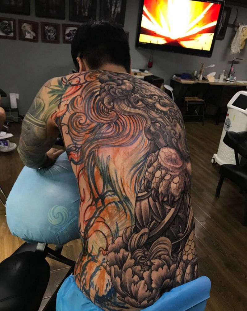 当前位置: 首页 >浙江省杭州市纹身店-异绣堂纹身工作室纹身图案>唐狮半成品纹身图片_人物成品手稿宗教原创鬼神国画字符写实背部纹身图案