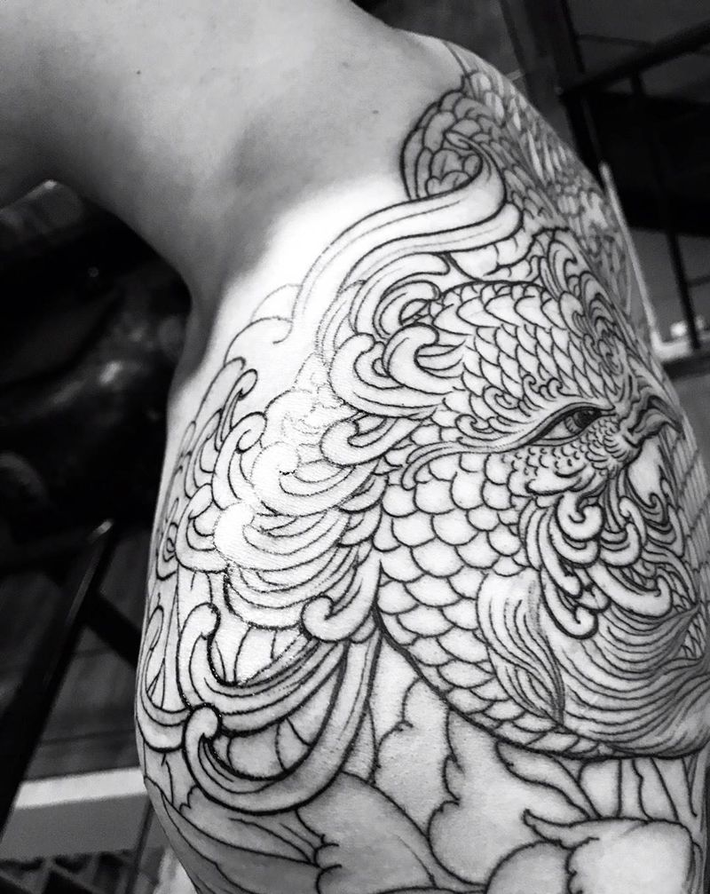 当前位置: 首页 >浙江省杭州市纹身店-异绣堂纹身工作室纹身图案>凤凰半背纹身图片_肩部背部凤凰传统动物纹身图案