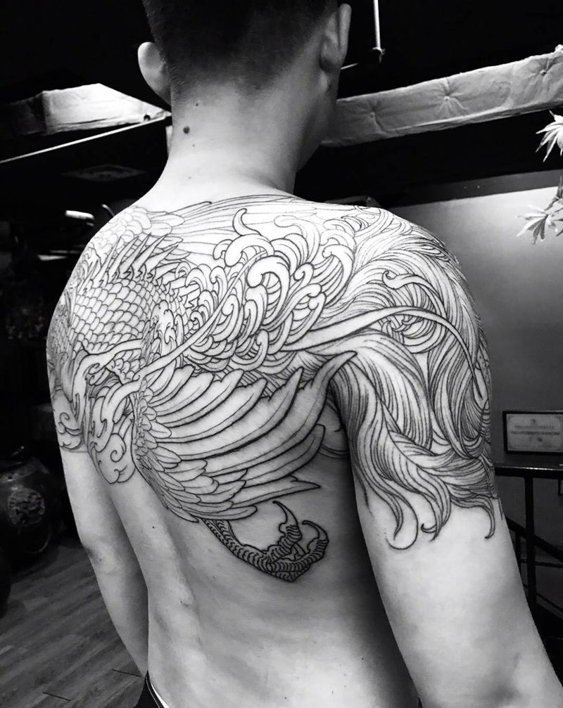 当前位置: 首页 >浙江省杭州市纹身店-异绣堂纹身工作室纹身图案>凤凰半背纹身图片_肩部背部凤凰传统动物纹身图案