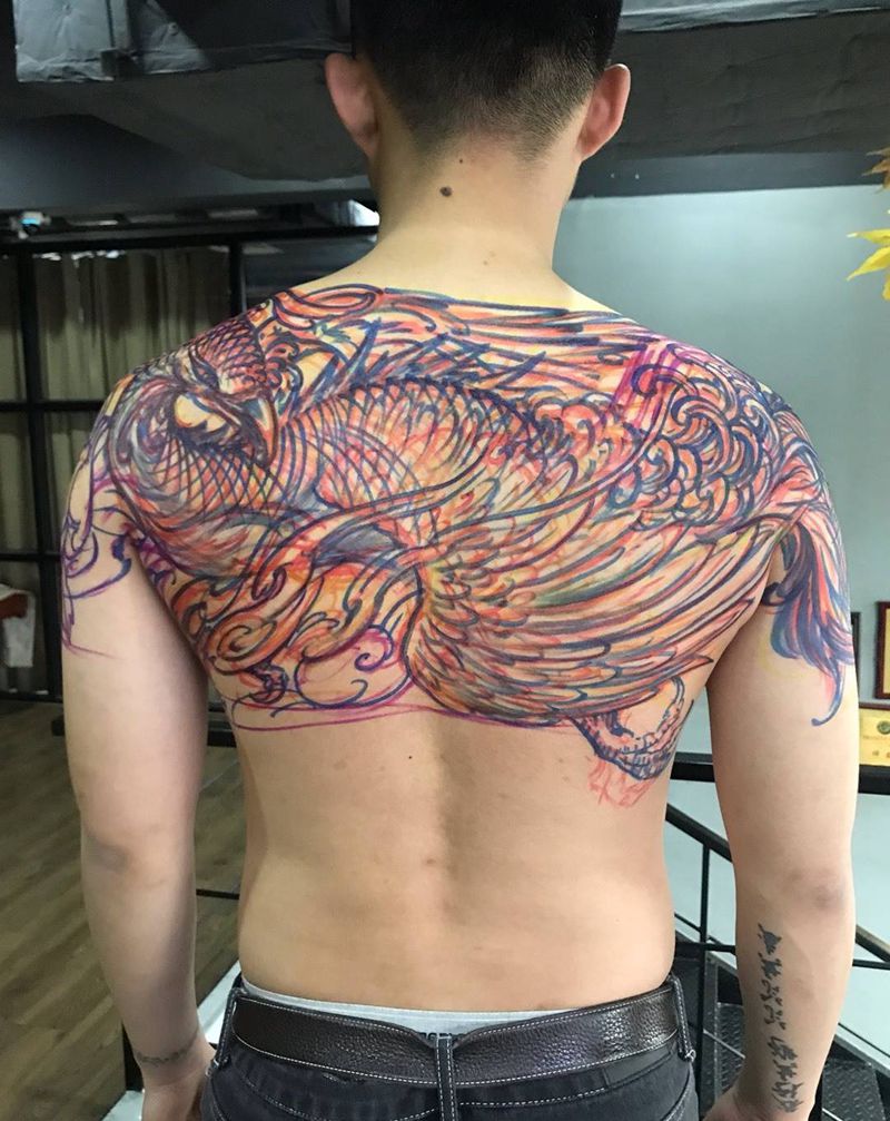 当前位置: 首页 >浙江省杭州市纹身店-异绣堂纹身工作室纹身图案>凤凰半背纹身图片_肩部背部凤凰传统动物纹身图案