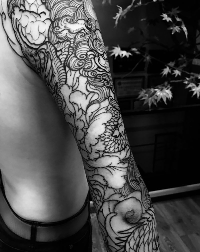 当前位置: 首页 >浙江省杭州市纹身店-异绣堂纹身工作室纹身图案>唐狮龙花臂纹身图片_手部手臂新传统纹身图案